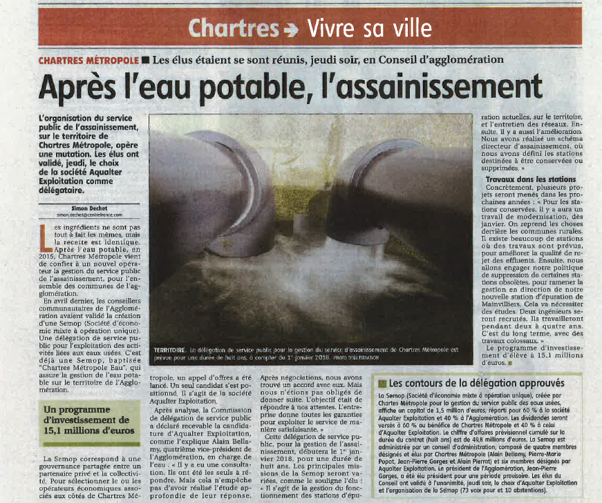 Chartres Métropole confie la gestion du service public de l’assainissement à Aqualter Source : L’ECHO RÉPUBLICAIN – 28/10/2017 dsi2025-12-23T08:40:57+01:006 novembre 2017| Partagez cet article sur les réseaux sociaux ! FacebookXRedditLinkedInTumblrPinterestVkEmail