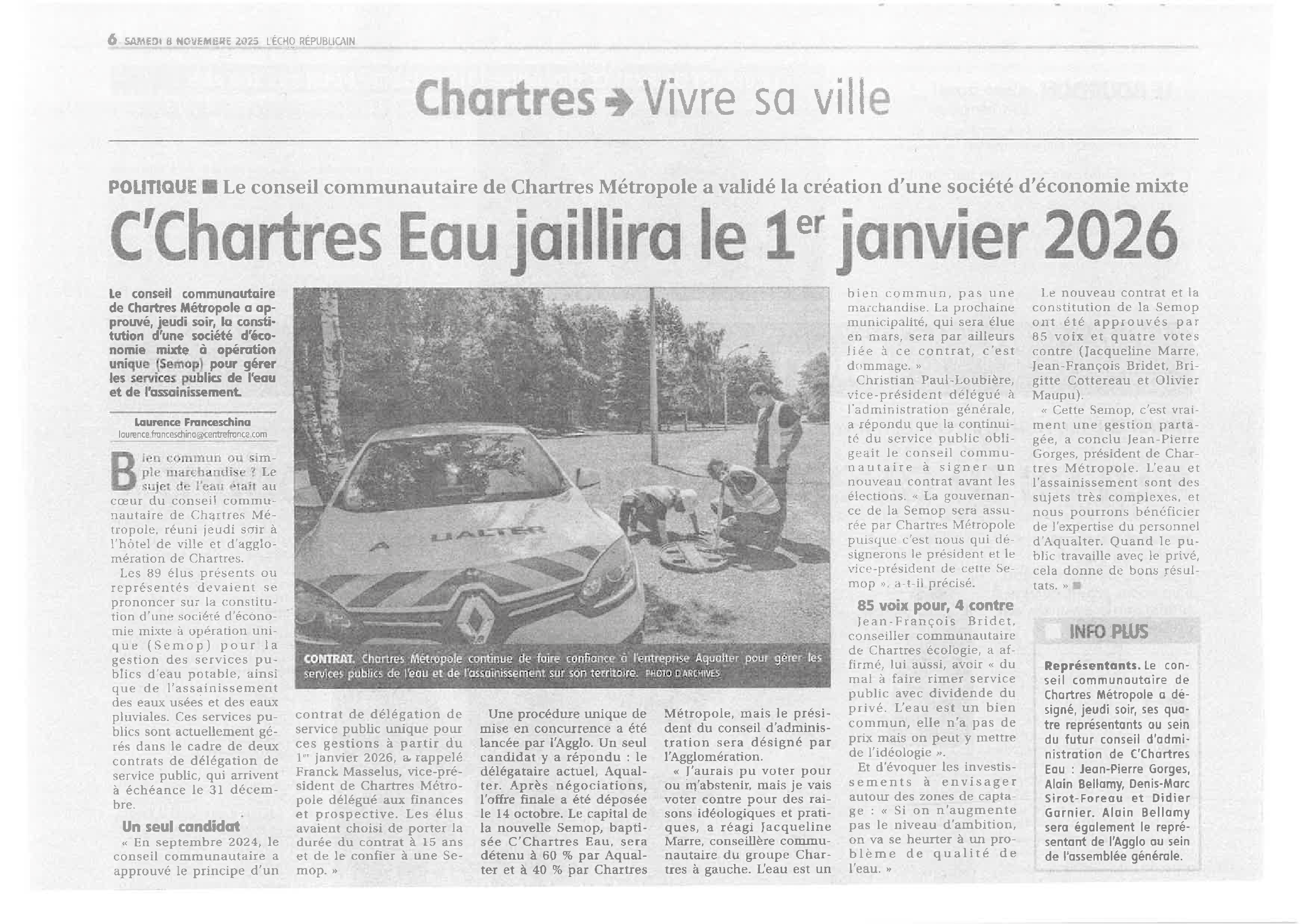 Chartres Métropole confie la gestion du service public de l’eau potable et de l’assainissement à C’Chartres Eau … Source : L’ECHO RÉPUBLICAIN – 8/11/2025 Elodie PESSOT2025-12-29T09:58:17+01:001 janvier 2026| Partagez cet article sur les réseaux sociaux ! FacebookXRedditLinkedInTumblrPinterestVkEmail